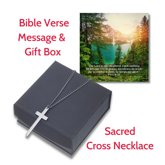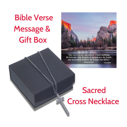 Sacred Cross Necklace, Bible Verse Psalm 23, Yosemite Sunset