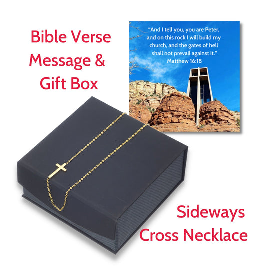 Sideways Cross Necklace, Bible Verse Matthew 16:18, Sedona Chapel
